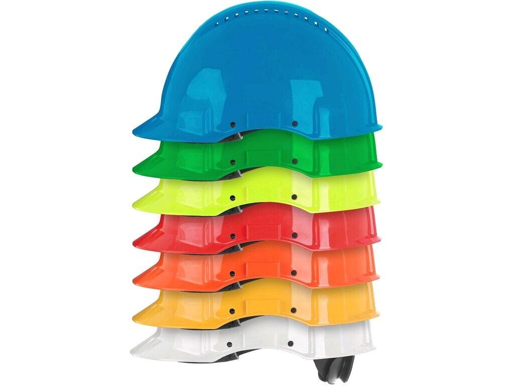 Ochranná přilba se 4-bodovým textilním uchycením s upínacím kolečkem pro individuální nastavení velikosti, teplotní odolnost: -30°C až +50°C, hmotnost: 310 g, uvicator pro určení životnosti přilby, možnost otočení upínacího systému o 180°, což umožňuje nosit přilbu přední částí dozadu. Doporučené použití: stavebnictví a lehký průmysl.