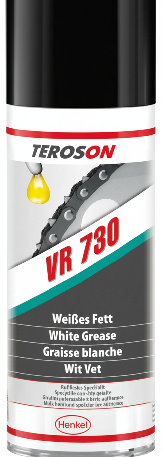 Teroson VR 730 je bílý lubrikační aerosolový sprej používaný pro mazání otevřených mechanismů, ozubených soukolí, řetězů a spojek.